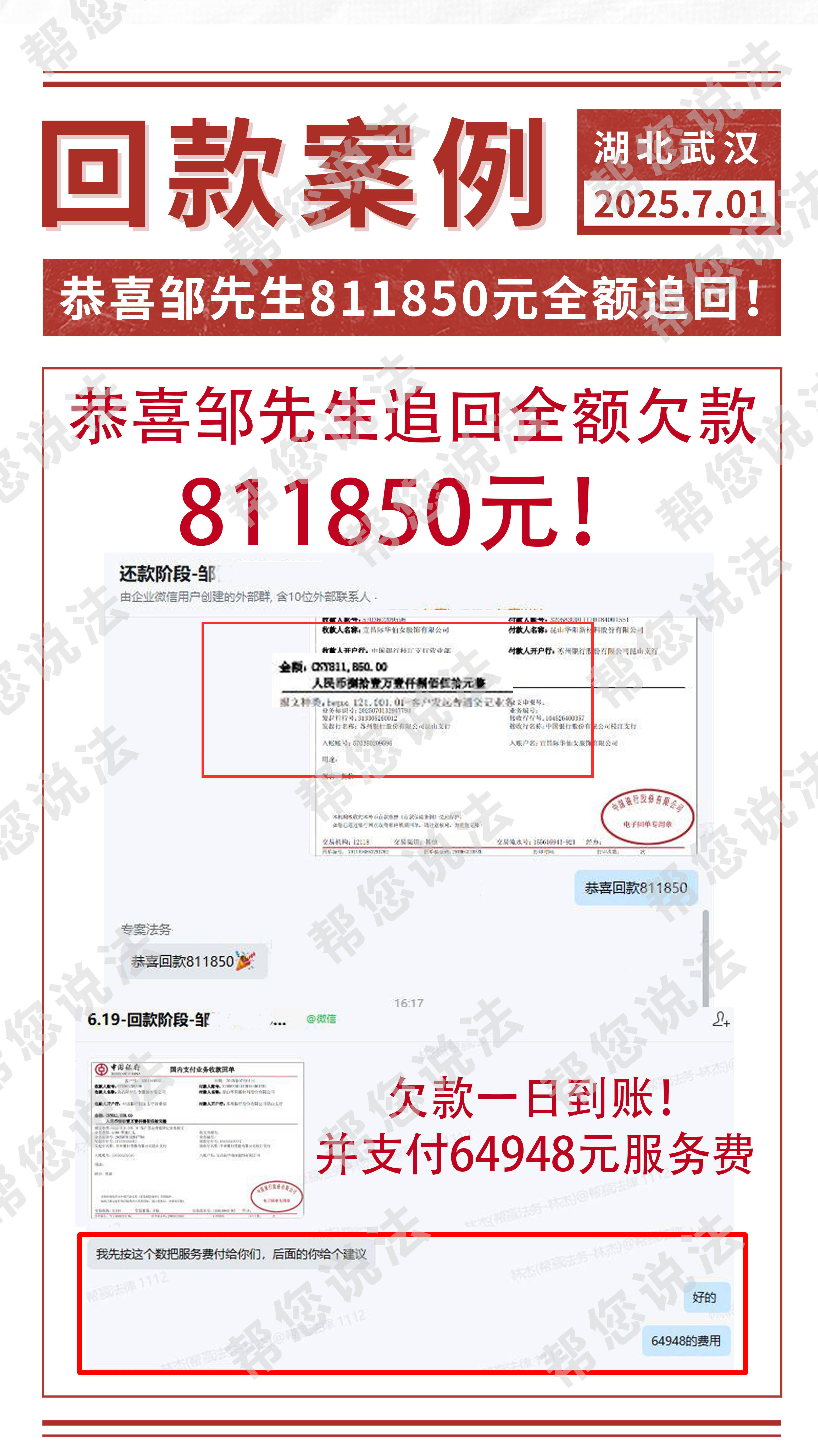 在帮赢说法的高效介入与专业协调下,邹先生于7月1日成功收回全部拖欠货款811850元,短短十余天便彻底解决了这起棘手的经济纠纷,让邹先生的压力得到及时缓解。