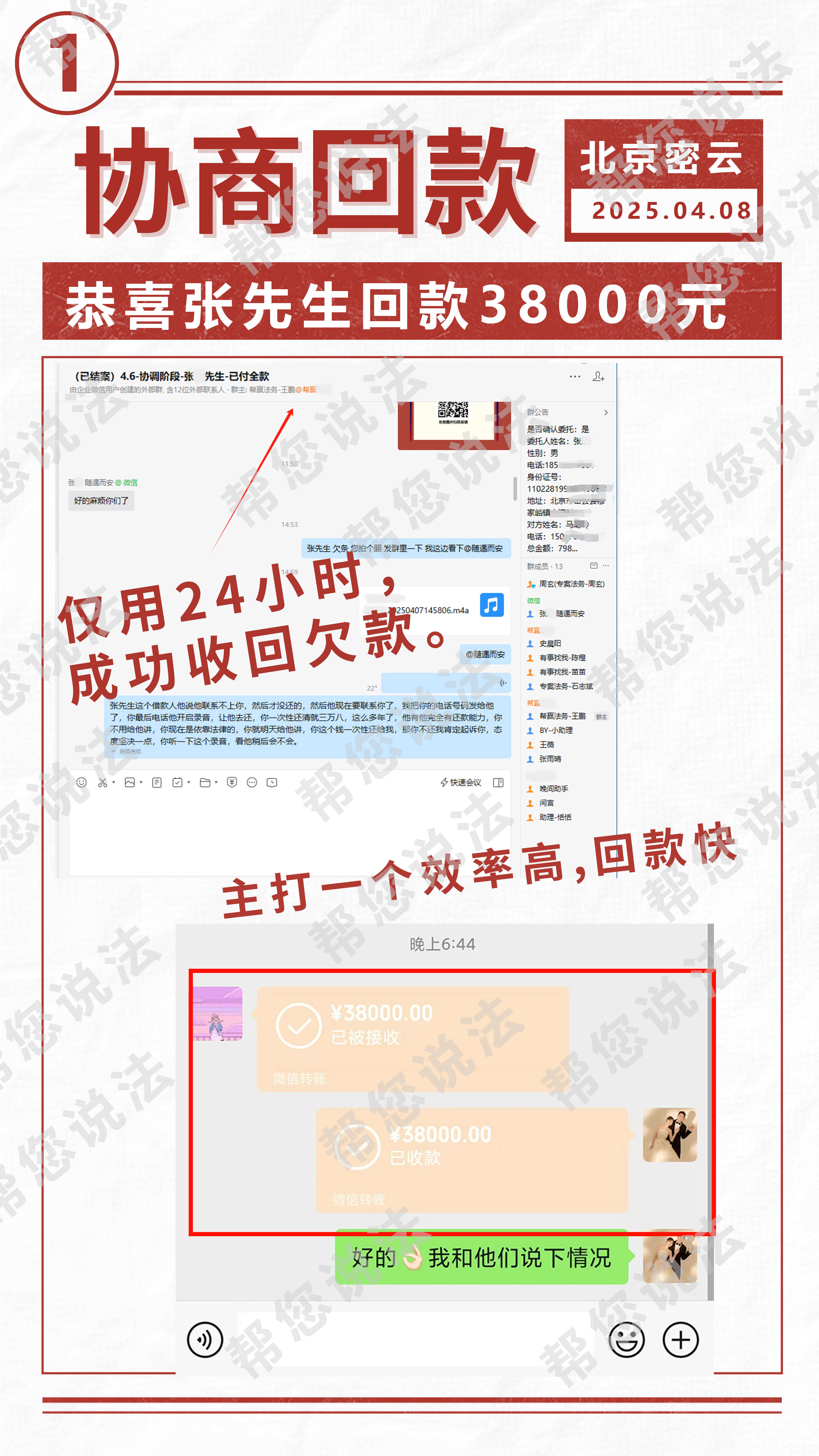 在帮赢说法的帮助下,马某某当天便偿还了全部38000元欠款,欠款全部追回。