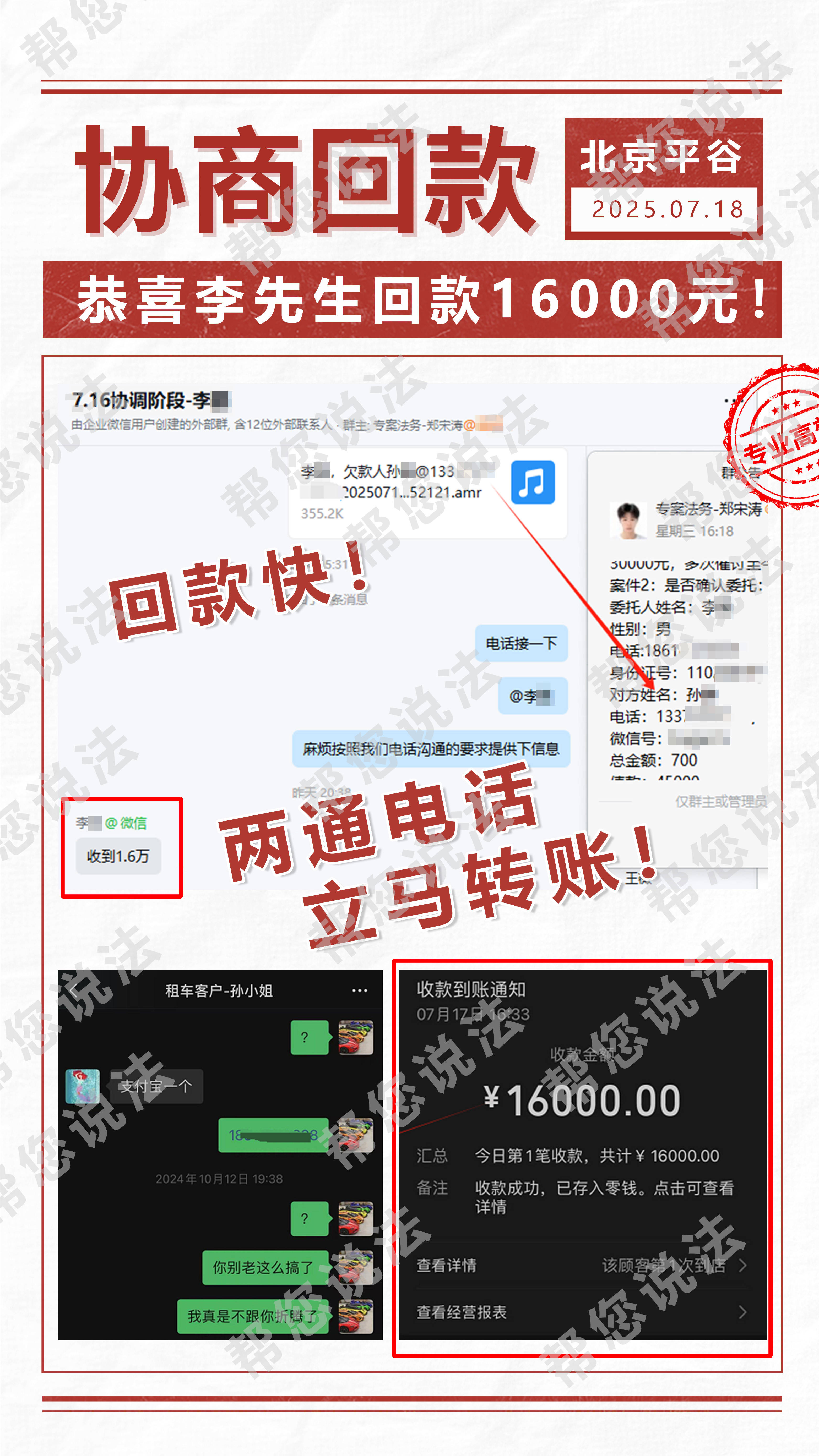 帮赢说法接手案件后,仅通过两次专业且有力度的电话沟通与孙某某取得联系,就成功让其态度发生转变。随后,孙某某立刻进行了转账操作。最终,在帮赢说法的助力下,李先生被拖欠的1.6万元汽车租赁款全额追回。