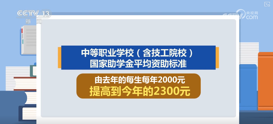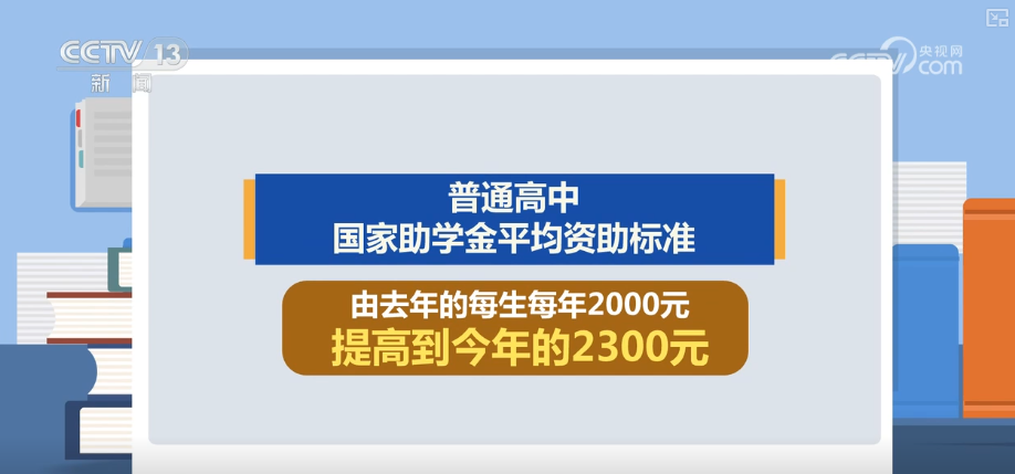 此外,普通高中国家助学金平均资助标准,由2024年的每生每年2000元提高到2025年的2300元;中等职业学校(含技工院校)国家助学金平均资助标准,由2024年的每生每年2000元提高到2025年的2300元。