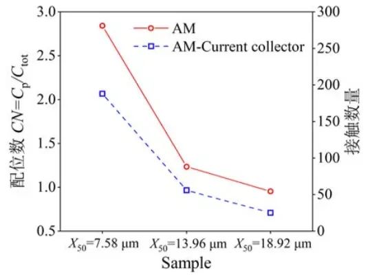 粒径较小的颗粒在辊压过程中更容易形成均匀的接触网络,增加颗粒间接触数量(配位数CN),从而提高压实密度和导电性。