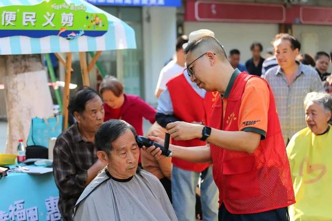 “鼓浪屿好小哥”快递青年服务队队员为老人剪发(资料图)。思明区委社会工作部供图