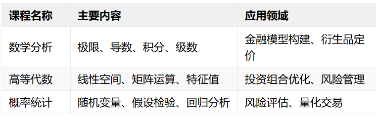 数学金融与金融工程作为交叉学科,课程设置融合了数学、金融和计算机三大领域。以下是主要课程分类:
