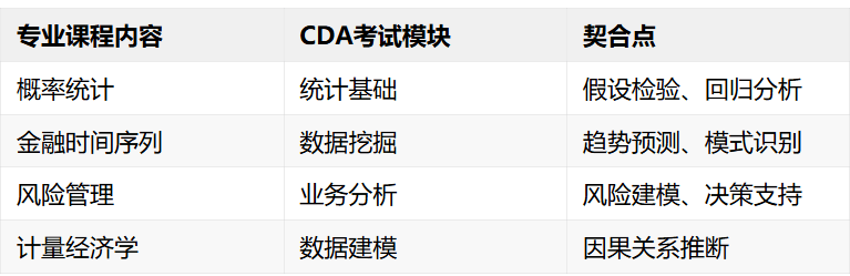 在数字化金融时代,数据分析能力已成为行业基本要求。CDA数据分析师认证作为业内认可的专业资质,其知识体系与专业课程高度契合: